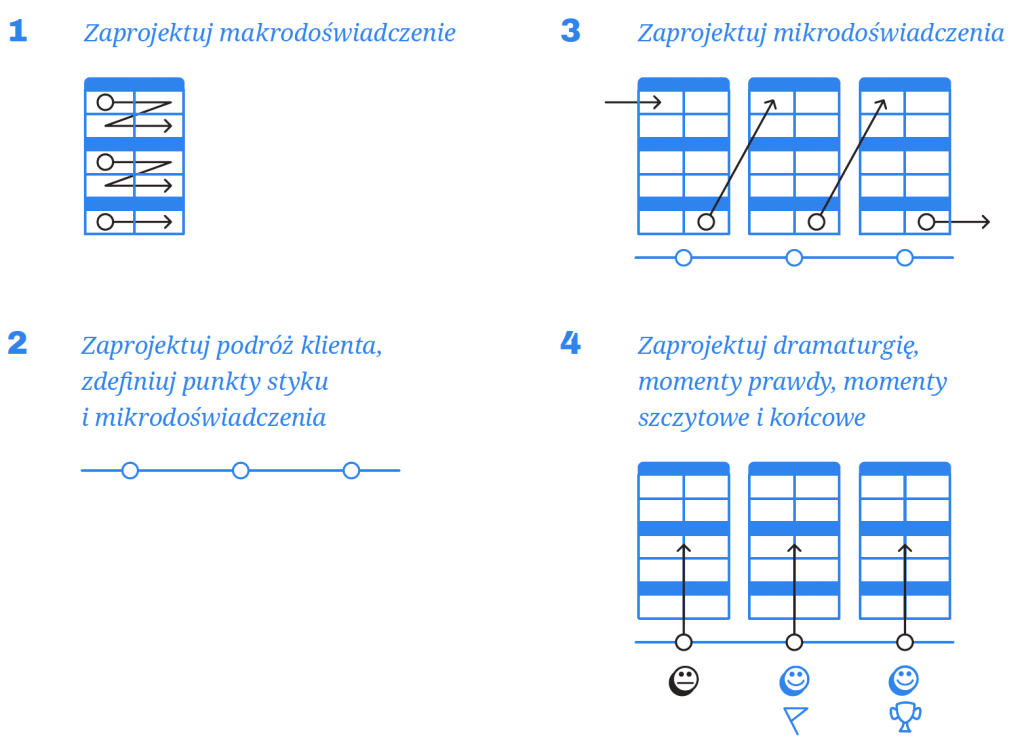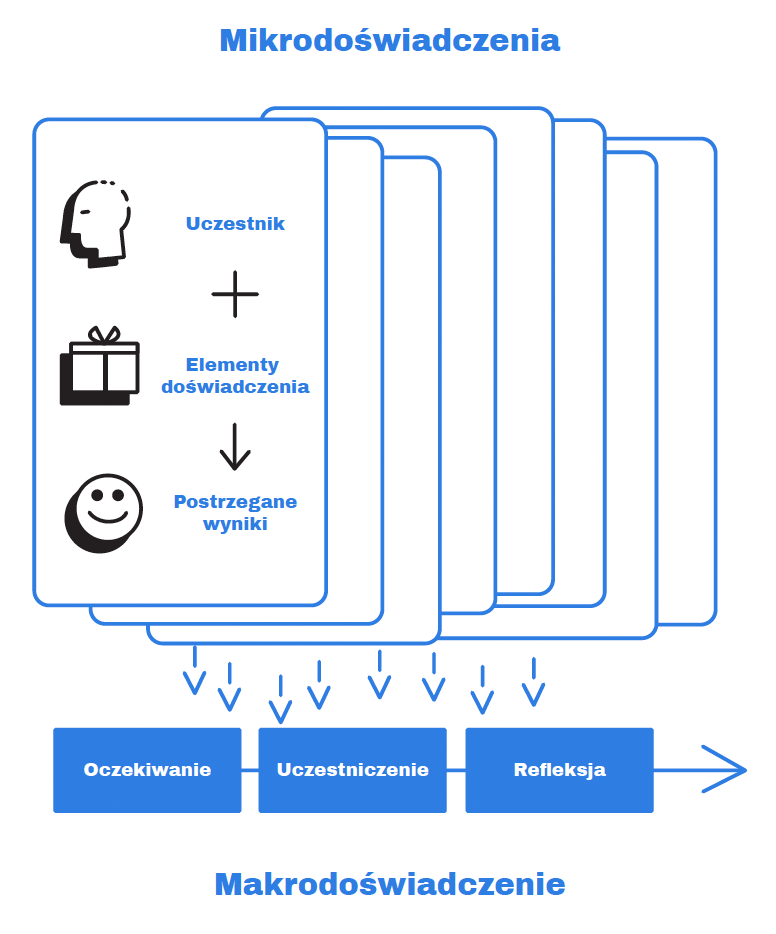 Każda z takich interakcji pomiędzy klientem a rzeczami, osobami albo otoczeniem tworzy doświadczenia w umyśle klienta. Dokłada także nowe elementy do całościowego doświadczenia: emocje, myśli, odczucia. Te cząstkowe doświadczenia będziemy dalej nazywać mikrodoświadczeniami, a ostateczne, wynikowe doświadczenia z podróży klienta — makrodoświadczeniem.
